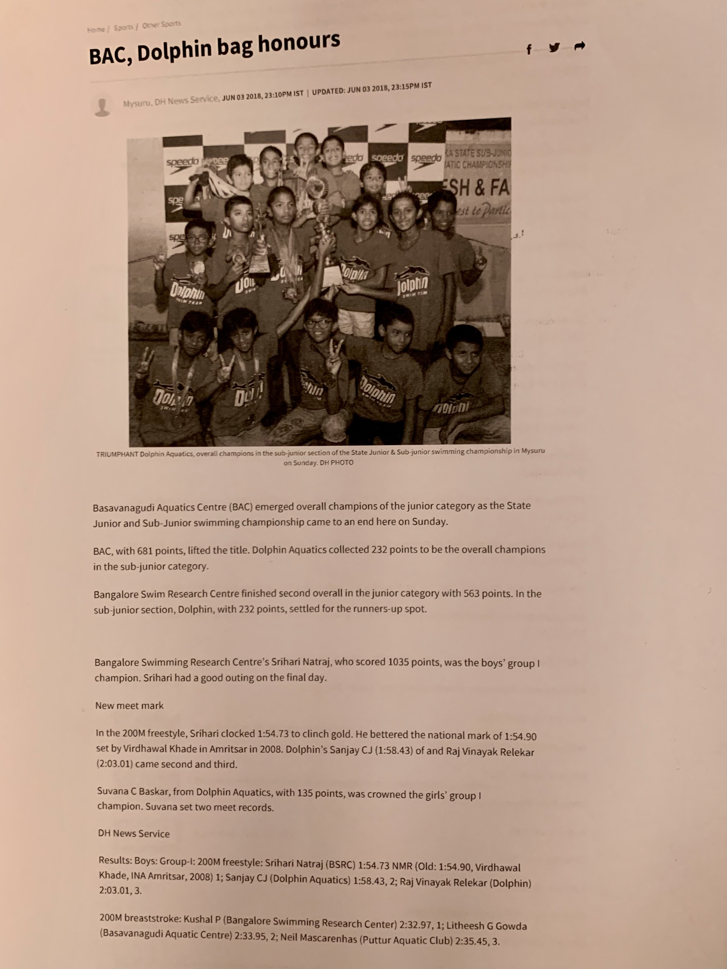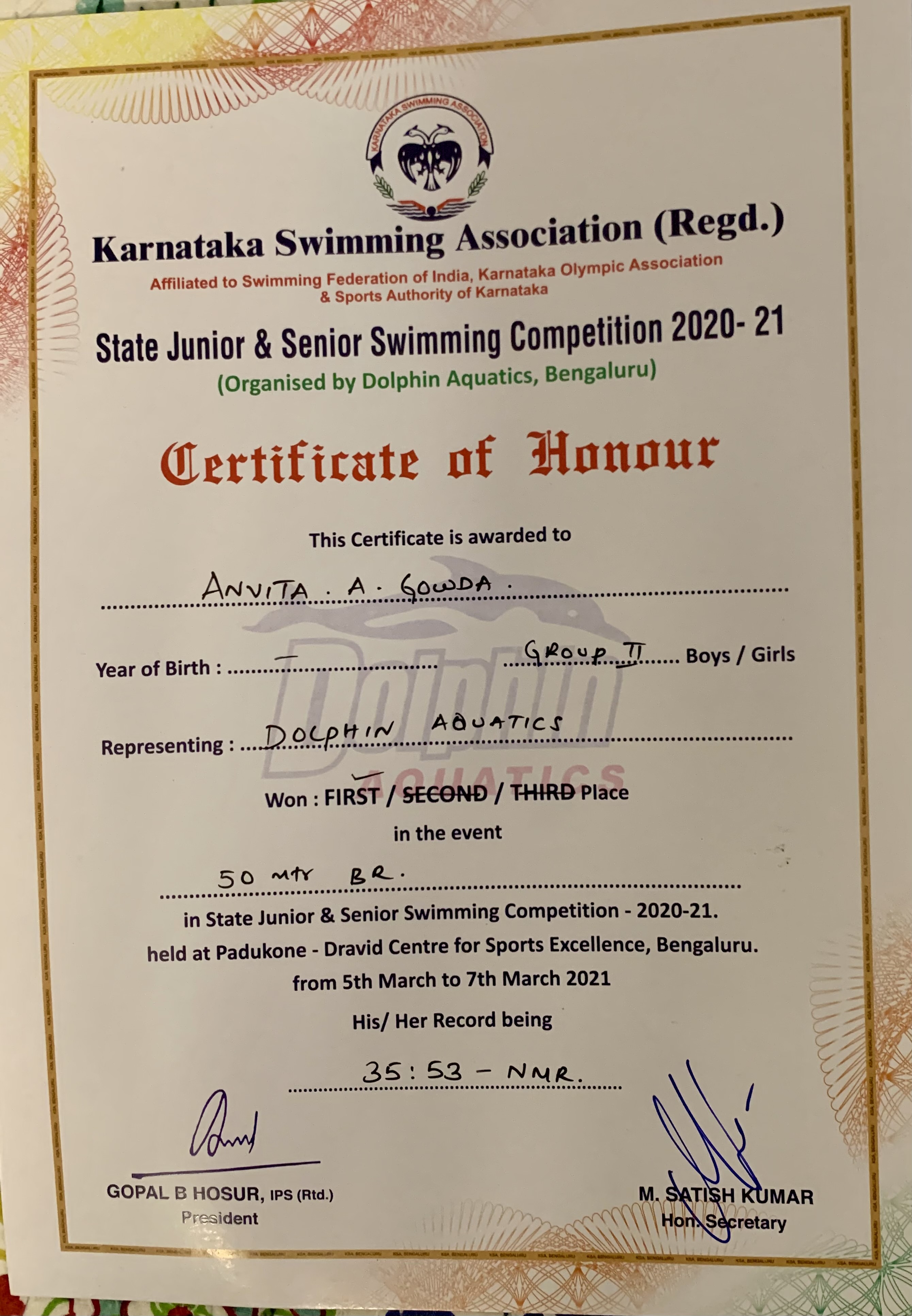Recognized by the Karnataka Swimming Association